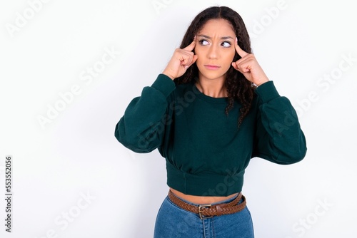 teen girl with curly hair wearing green sweater over white background with thoughtful expression, looks away, keeps hand near face, thinks about something pleasant.
