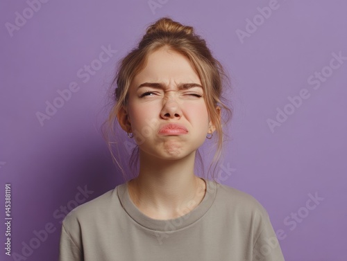 Teen girl with tense brows and rapid blinking, head slightly tilted, lavender background