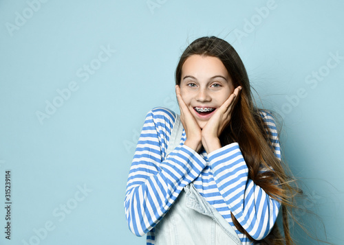 Teenage female in jeans overall, striped sweatshirt. She smiling, showing thumbs up, winking, posing on blue background. Close up