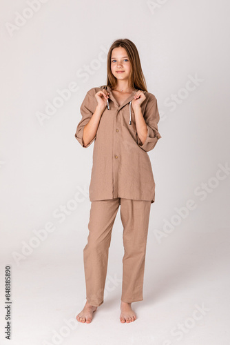 Teenage girl in brown casual suit on white background. girl's emotions. copy space. goods for children and student.