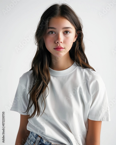 Teenage girl in white t-shirt and blue jeans