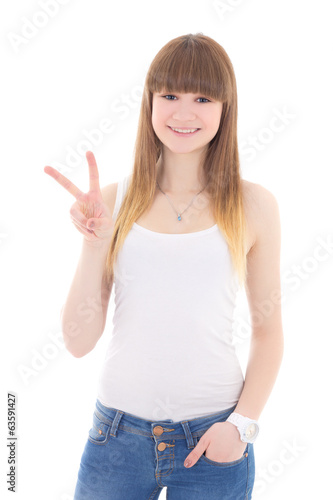 teenage girl in white t-shirt showing victory sign isolated on w