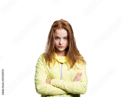 Teenage girl in yellow running jacket. Studio shot, isolated.