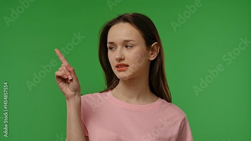 Teenage girl posing at camera pointing finger up, positive expression, isolated on chroma key green screen studio background mockup.
