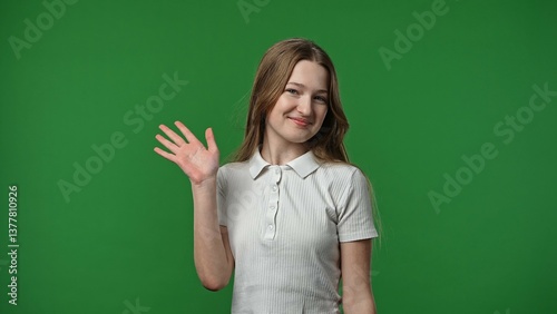 Teenage girl posing at camera smiling and waving hand, positive expression, isolated on chroma key green screen studio background mockup.