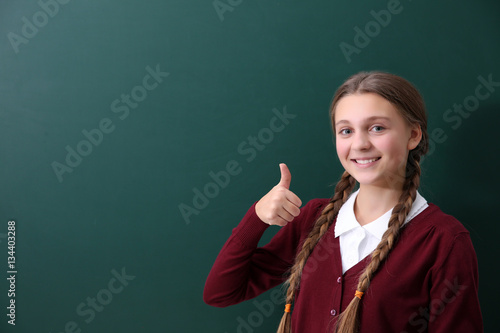Teenage girl standing near green school blackboard