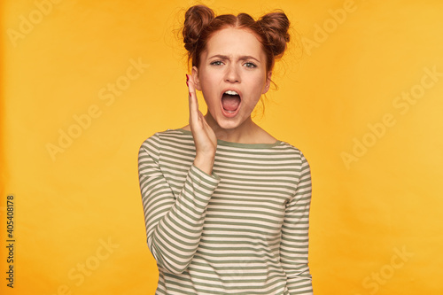 Teenage girl, unsatisfied looking red hair woman with two buns. Demonstrating her disappointed feelings. Wearing striped sweater and shout loud at the camera isolated over yellow background