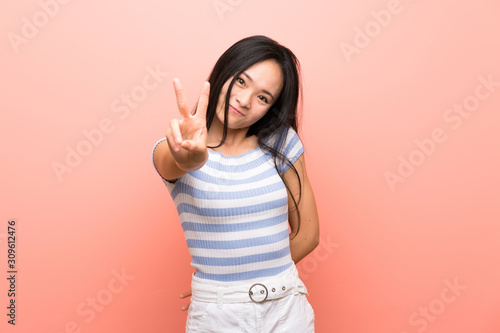 Teenager asian girl over isolated pink background smiling and showing victory sign