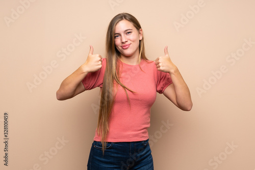 Teenager blonde girl over isolated background giving a thumbs up gesture