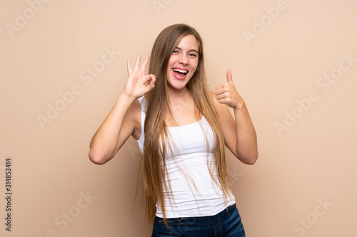 Teenager blonde girl over isolated background showing ok sign and thumb up gesture