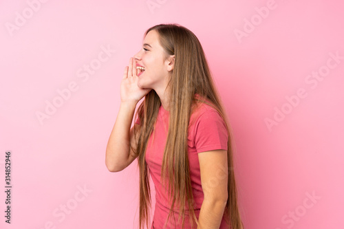Teenager blonde girl over isolated pink background shouting with mouth wide open