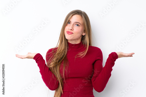 Teenager blonde girl over isolated white background having doubts while raising hands