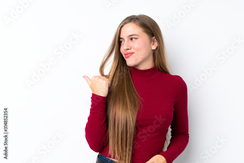 Teenager blonde girl over isolated white background pointing to the side to present a product