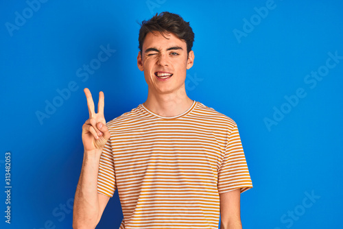 Teenager boy wearing casual t-shirt standing over blue isolated background smiling with happy face winking at the camera doing victory sign. Number two.
