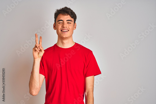 Teenager boy wearing red t-shirt over white isolated background smiling with happy face winking at the camera doing victory sign. Number two.
