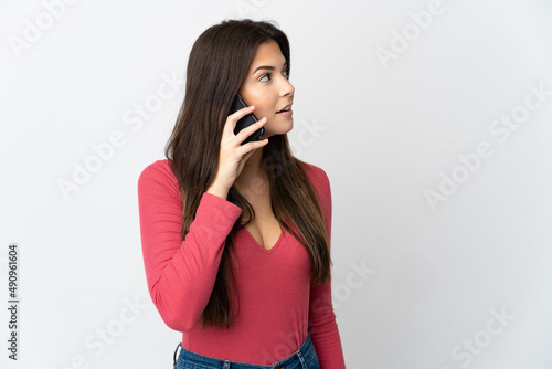 Teenager Brazilian girl isolated on white background keeping a conversation with the mobile phone with someone