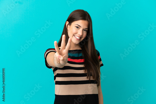 Teenager Brazilian girl over isolated blue background happy and counting three with fingers