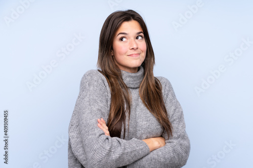 Teenager Brazilian girl over isolated blue background making doubts gesture while lifting the shoulders