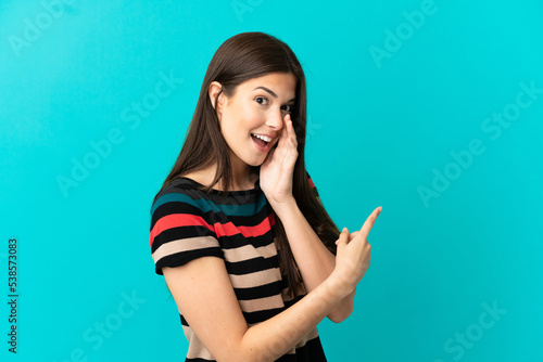 Teenager Brazilian girl over isolated blue background pointing to the side to present a product and whispering something