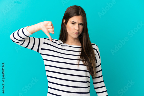 Teenager Brazilian girl over isolated blue background showing thumb down with negative expression
