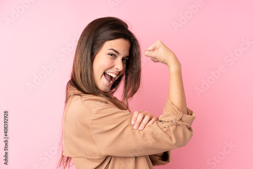 Teenager Brazilian girl over isolated pink background making strong gesture