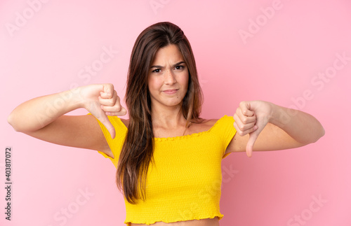 Teenager Brazilian girl over isolated pink background showing thumb down