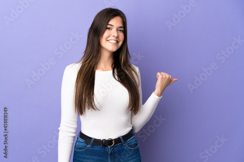 Teenager Brazilian girl over isolated purple background pointing to the side to present a product