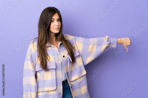Teenager Brazilian girl over isolated purple background showing thumb down with negative expression