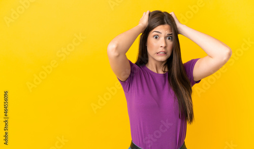 Teenager Brazilian girl over isolated yellow background doing nervous gesture