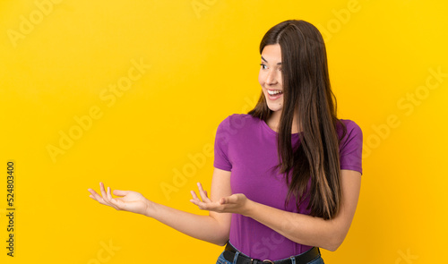 Teenager Brazilian girl over isolated yellow background with surprise expression while looking side