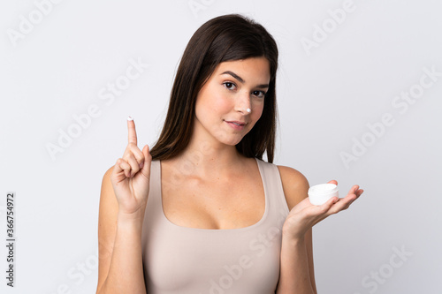 Teenager Brazilian girl with moisturizer over isolated white background