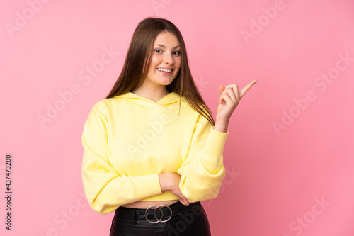 Teenager caucasian girl isolated on pink background happy and pointing up