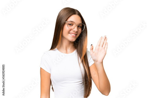 Teenager caucasian girl over isolated background saluting with hand with happy expression