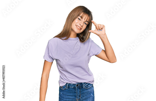 Teenager caucasian girl wearing casual clothes smiling and confident gesturing with hand doing small size sign with fingers looking and the camera. measure concept.