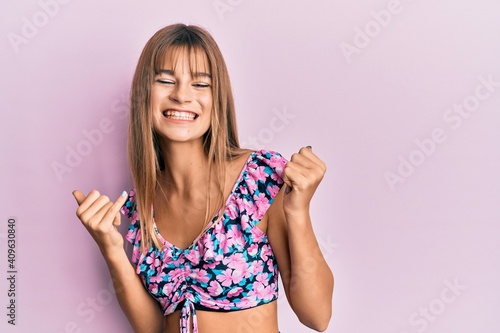 Teenager caucasian girl wearing casual clothes very happy and excited doing winner gesture with arms raised, smiling and screaming for success. celebration concept.