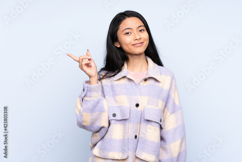 Teenager Chinese woman isolated on blue background intending to realizes the solution while lifting a finger up