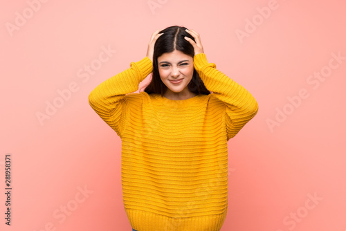 Teenager girl over isolated pink wall frustrated and takes hands on head