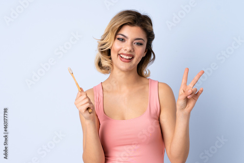 Teenager girl brushing her teeth isolated on blue background pointing up a great idea