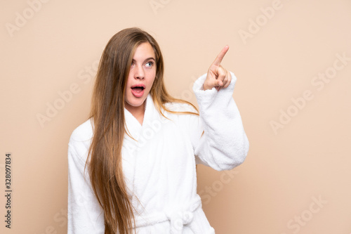 Teenager girl in a bathrobe over isolated background pointing away