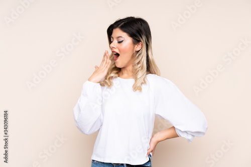 Teenager girl isolated on beige background yawning and covering wide open mouth with hand