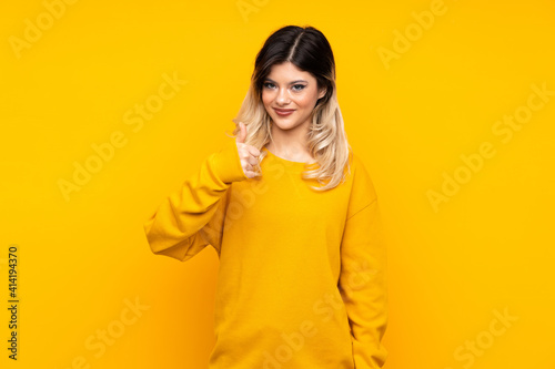 Teenager girl isolated on yellow background giving a thumbs up gesture