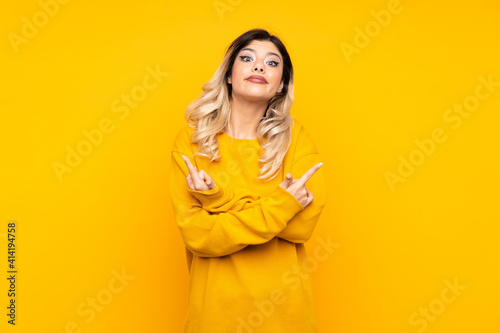 Teenager girl isolated on yellow background pointing to the laterals having doubts