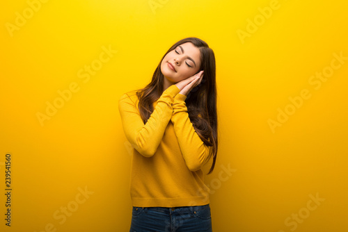 Teenager girl on vibrant yellow background making sleep gesture in dorable expression