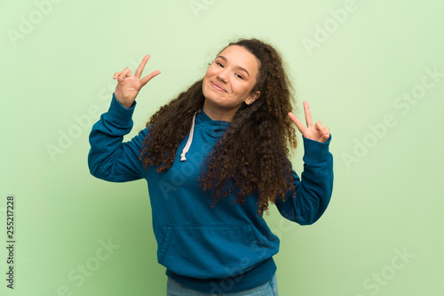 Teenager girl over green wall smiling and showing victory sign with both hands