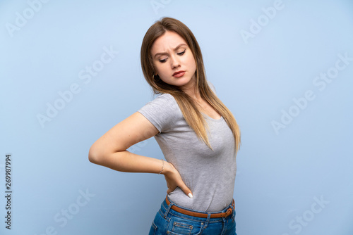 Teenager girl over isolated blue wall suffering from backache for having made an effort