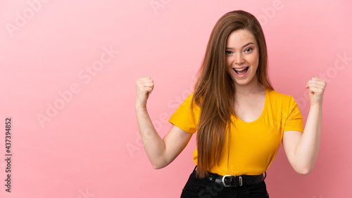 Teenager girl over isolated pink background celebrating a victory in winner position
