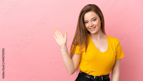Teenager girl over isolated pink background saluting with hand with happy expression