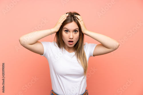 Teenager girl over isolated pink wall with surprise facial expression