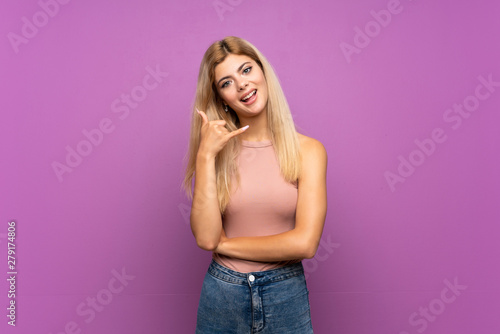 Teenager girl over isolated purple background making phone gesture. Call me back sign