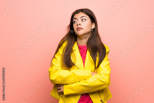 Teenager girl over pink wall making doubts gesture while lifting the shoulders